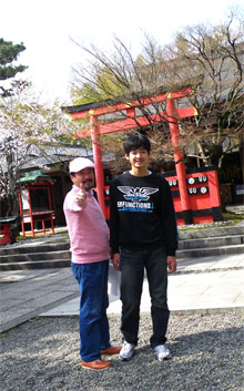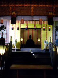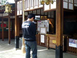 神殿奥の左側で鼓を奏でたり、神主さん一人で仕切る ♪〜 シュイ〜ン♪ やおら厳かなる雅楽の調べが録音されたミュージックスタート、 「これにて八木 能世さまの厄除け祈願、滞りなくお勤めさせていただきました」 外に出るところでは、どうやら次のお客さんが待機。 すると神主さん「今日はこれでストップしてくださいね」と、 それでも神殿で自分一人のためだけに厄除け祈願していただけるありがたさ、 すると後ろから杜人が「お父さん お払い中に神殿で写真撮るんはちょっと」・・・