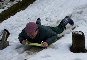 雪の積もって幅の狭い野沢温泉街の道をエスティマでやっとこさ登り、