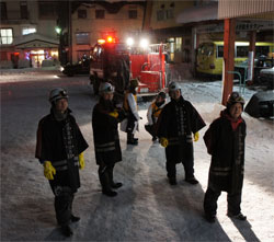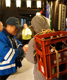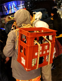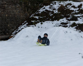 浴槽の真ん中は仕切られているが、 でも 24時間誰でもタダでOKの草津や、23時までだがフリーの野沢温泉。 個人的にも鉄湯の風味はあまり好みではなく、 野沢温泉へと帰る道すがらスキーを楽しんでるであろう詠人に携帯で連絡すると、 今夜の宿は温泉街から雪上車でしか行けない、ゲレンデ前にある‘ロッジでんべえ’。 何やねん、その発想・・・お客在りきで営業できるはずやのに。 無理に?乗せていただいた雪上車で宿にたどり着き、 食事は予想通りのトホホめし、コメント対象外。 許せないのが、ここからだ。 「火祭りへは8時半以降に雪上車で送ります、それまでは面白くないです」発言から始まり 「村人が一升瓶を持って練り歩き、お酒を勧めてくれますが飲まないでください」 「毎年 腰を抜かして、歩けなくなる人が多発します」・・・ なんともふざけた、アンチ火祭り詣で的ネガティブ発言のオンパレード! 「お父さん 火祭り危険って言ってるから、ボク 行くのん辞めとく」とちびる詠人。 ここで完全にぶち切れた! 詳しく書くと長くなるので割愛するが、要するにチェックアウト! 野沢温泉の火祭りに憧れ、ようやく実現したこの旅。 雪上車でふもとへ送られ野沢温泉街へ。 まずは旅館組合で改めて今夜の宿を探してもらい、 組合事務所は振る舞い酒のコーナーになっており、
