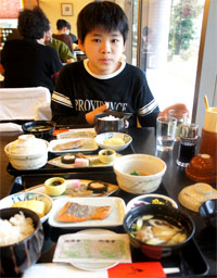部屋に戻ればオヤジはアテとビール、詠人はおやつとジュース。 1月3日(月) 福知山動物園のウリザル&雪遊び 明けた3日は曇り時々晴れ、風は無く穏やかな日和だ。 それでも大事な朝風呂は欠かさず、6時起きで露天風呂へ。 そして朝食・・・寂しいオヤジには嬉しい正月メニューが並ぶ。