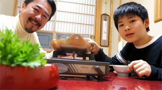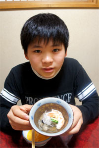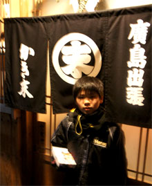 高台にあるホテルの露天風呂は、流れる風が心地良い。 ホッコリ温まって部屋に戻ると、さっそくおやつにゆで卵の‘玉ごろー’を食す詠人。 しばし部屋でゆっくり過ごし、向かうは予約したかき末。 コースは詠人だけにして、親父は鍋だけ・・・とお願いしたが
