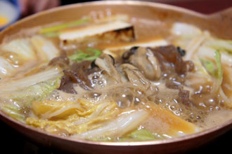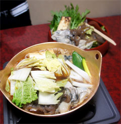 雰囲気ある建物の奥、トイレの手前の末室へ案内され コースだと言え最初にかき鍋からスタート、 つい5日前に店でかき鍋をたっぷり食べたばかりなので感激は薄いが、 良い雰囲気とは裏腹に、本日最後の一室だけあって末室トイレ前。 昔ながらの日本建築に強引に設えたトイレは極寒の僻地、 仕上げの牡蠣ご飯は雰囲気あるお釜で登場するが、