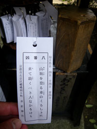 ここ数年来の災難続きで、改めて自分の業の深さを自覚するガゆえ 社務所に厄除け祈願&商売繁盛の申し込みをし、 その間に古い祈念神石を所定の場所に返納し、 そして嵐電フリーチケットの特典で、おみくじを無料で・・・ GOD!