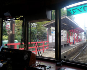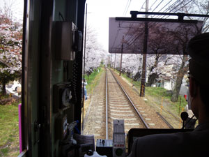 一斉にカメラのシャッター音や写メが鳴り出す。 それ程でもない桜のトンネルを抜けると宇多野駅へ到着、