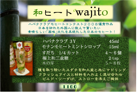 2008年度 ハバナクラブモヒートコンテストの、 優秀作品に選ばれたカクテル。木の芽や酢橘を基調とした和のテイスト。 日本酒ベースの「WINDSOCK」が原型。 極上和三盆糖を使用し、さらに風味が極まり完成度アップ!